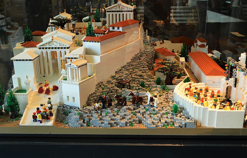 Diese Athene-Schnitzeljagd kommt richtig gut an, völlig fasziniert sind sie dann aber von dem Nachbau der Akropolis aus Lego-Steinen. Da bestaunen sie jedes Detail und schauen viel genauer hin als auf der echten Akropolis. Tja …