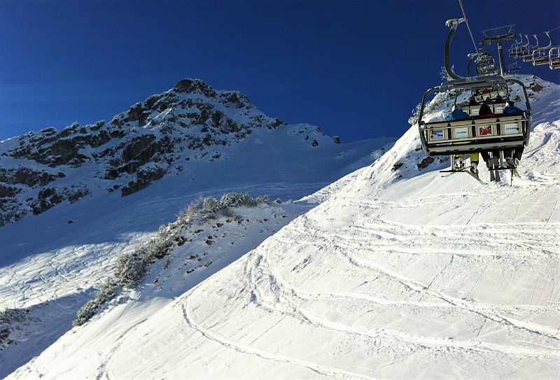 Unsere wunderbare Entschädigung folgte auch. Tausendprozentig! Am Montag war keine einzige Wolke zu sehen. Also: Neuschnee, Sonne, knallblauer Himmel, leere Montagspisten außerhalb der Ferien.