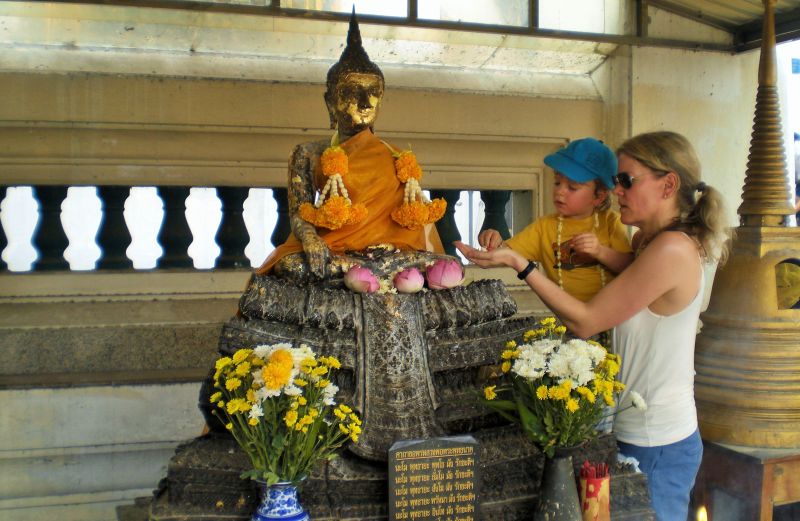 Und auch die Kids haben den Großteil der Besichtigung interessiert mitgemacht: Buddha allover, Menschen, die mit ihrem Kopf beim Beten den Boden berühren, und überall der Geruch von Weihrauch, unheimlich viel Gold und Glitzer …