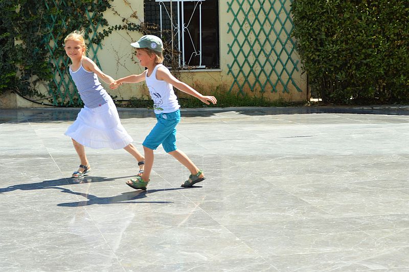 Das hatte ich erwartet und das war dann auch so: Die Griechen, die uns begegnet sind, waren alle ganz entzückend zu unseren Kindern. Selbst coole Typen in coolen Bars haben lustige Kinder-Späßchen gemacht oder haben die beiden mit Keksen beschenkt. Unsere zwei wurden viel auf den Kopf getätschelt und ständig gab es Geschenke, so dass sie Griechenland jetzt für Eldorado halten. Kinder spielen in Griechenland nicht so eine Sonderrolle wie bei uns. Ich habe zum Beispiel selten Kindergerichte auf der Speisekarte gesehen, es gibt nicht allzu viele Familienzimmer in Hotels und auch Spielplätze scheinen mir in Deutschland öfter vorzukommen. Aber dafür laufen die Kids viel selbstverständlicher einfach so mit. Und es stört sich keiner an der Lärmerei, was ich mit unserem eher lauten Nachwuchs extrem angenehm fand.
