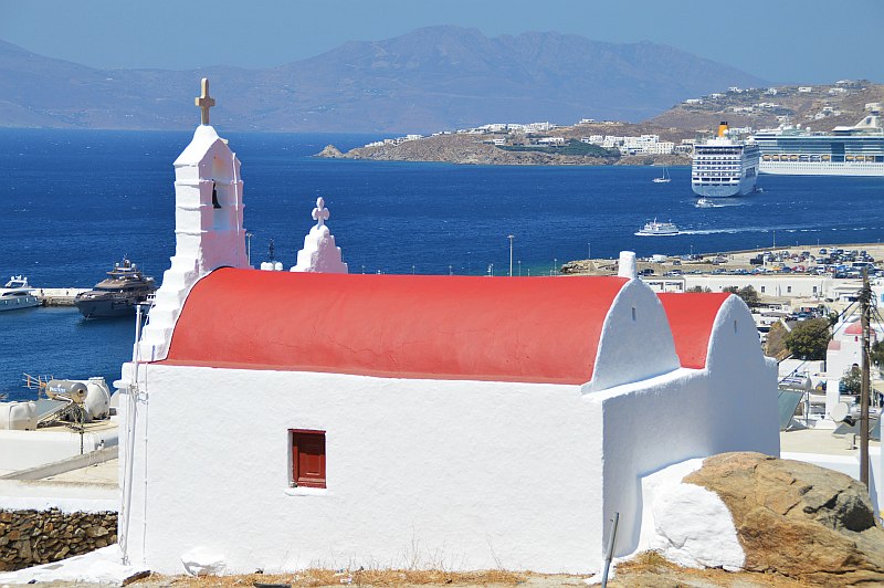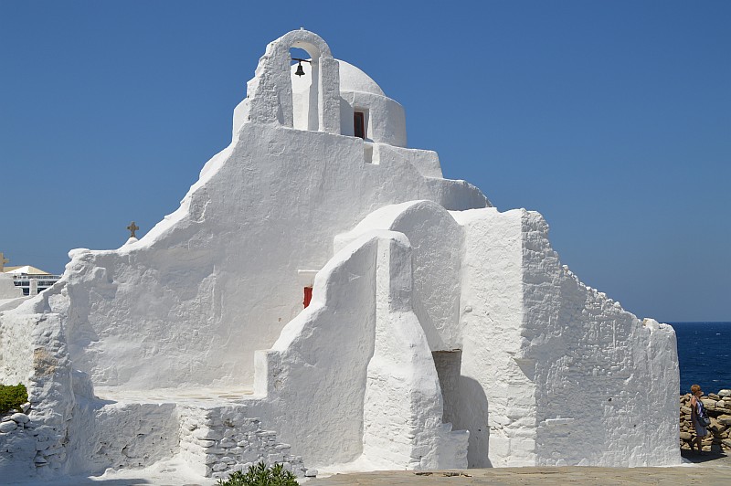Tja, Mykonos, was soll ich sagen? Wir waren einen Tag in Mykonos-Stadt und fanden alles wirklich wirklich schön. Ganz entzückende Gassen, eine supertolle architektonisch interessante Kirche, eine Aussicht auf Windmühlen vor strahlend blauem Meer und natürlich ein weiß-blaues Häuschen hübscher als das andere. Aber – wir waren Anfang September dort. Immer noch Hauptreisezeit. Und Mykonos ist Ankerpunkt von Kreuzfahrtschiffen. Muss ich mehr sagen? Es war ein bisschen wie bei uns auf dem Weihnachtsmarkt. Das ist sicher abends, wenn die Ausflügler wieder an Bord sind, alles viel besser. Hoffe ich zumindest. Was bleibt, ist allerdings die Tatsache, dass die Preise deutlich höher liegen als auf Paros und Naxos. Ich habe mich auf jeden Fall gefreut, dass wir uns nach langem Hin und Her bei der Planung dann doch für diese beiden Inseln entschieden haben.