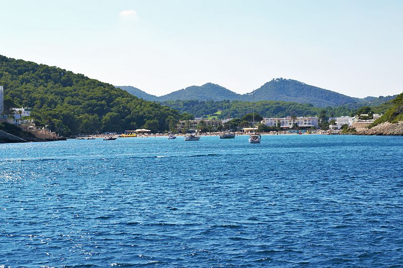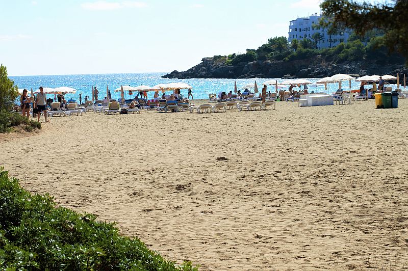Südlich von Santa Eulàlia liegt die Bucht Cala Llonga. Wir sind dorthin mit dem Boot (Abfahrt Yachthafen Santa Eulàlia, täglich mehrere Hin- und Rückfahrten) gefahren, man kann aber natürlich auch mit dem Auto über den normalen Landweg hin. Der Weg ist ausgeschildert. Um die Bucht stehen Hotels, die Gegend ist wie man so schön sagt, touristisch erschlossen. Ansonsten: Klares Wasser, feiner Sand, Restaurant, Strandbar, Liegen und Schirme.