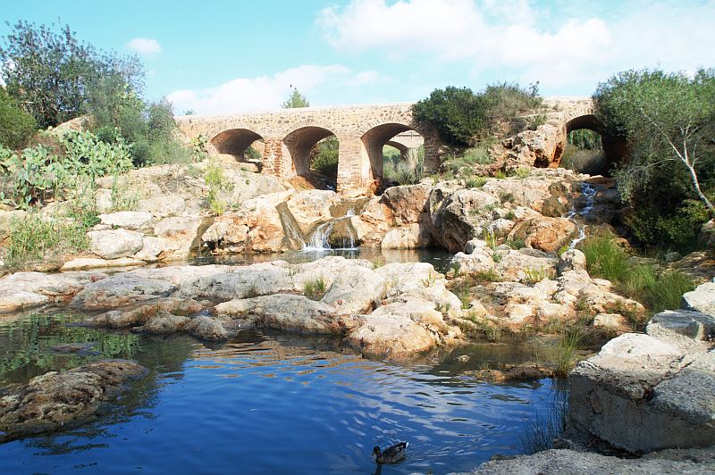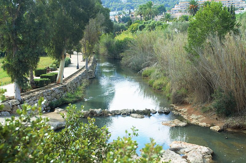 Der Rio de Eulàlia ist in den letzten Jahren mit viel Aufwand in einen sauberen Zustand zurückversetzt worden. Krass ist, dass vor nicht allzu langer Zeit darin gebadet wurde und Boote darauf fuhren – heute aufgrund des stark gesunkenen Pegelstandes kaum vorstellbar. Ursache ist, leider leider, der Tourismus. Die hohe Zahl an Gästen auf Ibiza verbraucht solche Unmengen an Wasser, das die Insel inzwischen ein massives Problem mit Wasserknappheit hat. Live und in Farbe zu begutachten am schmalen kleinen Rio de Santa Eulàlia, der früher mal ein tiefer breiter Fluss gewesen ist.
