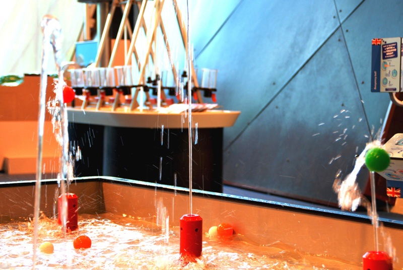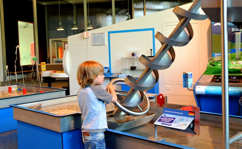 Oder der große Wasserbereich, in dem die Kids – mit extra Schürzen ausgestattet – Bälle auf kleine Fontänen setzen, die Schnecke des Archimedes (Wassertransport nach oben) ankurbeln oder einen Staudamm bauen können. Kiddo 2 war da kaum mehr wegzulotsen.