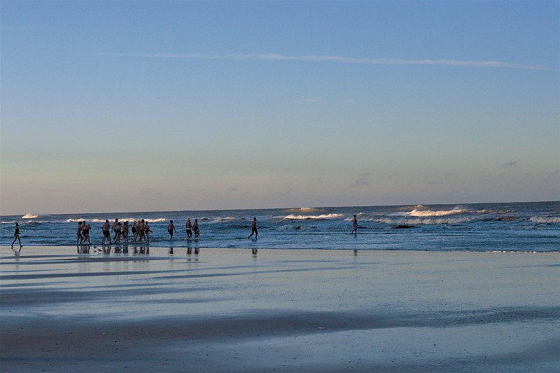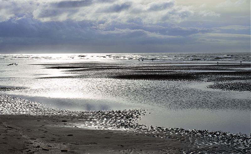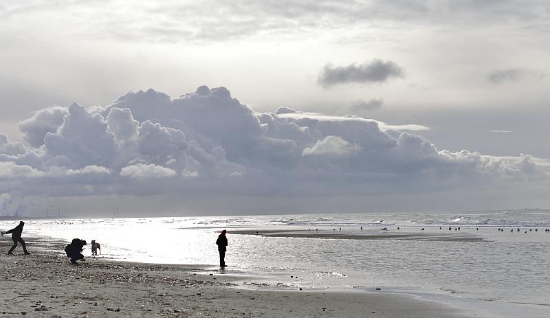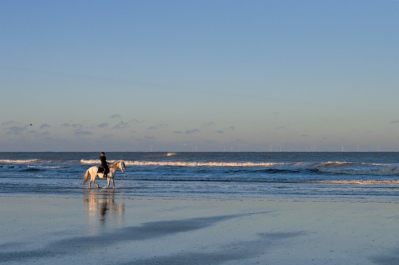 Und dann stehst du da und es passiert ganz viel an diesem leeren Strand: Eine Reiterin auf einem Schimmel trabt ins Bild, eine Gruppe extrem hartgesottener Niederländer in Badehosen geht tatsächlich schwimmen (4 Grad und eisiger Wind) oder ein Fahrradfahrer pest vorbei. Wie passend hier in Holland.