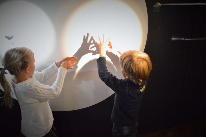 Der Faszination von Licht und Schatten erliegen unsere beiden sofort. Wobei ich zugeben muss, dass wir am längsten an dem Lichtspot standen, an dem wir mit eigenen Händen Tauben, Pferde, Krebse oder einen Hirsch formen konnten.