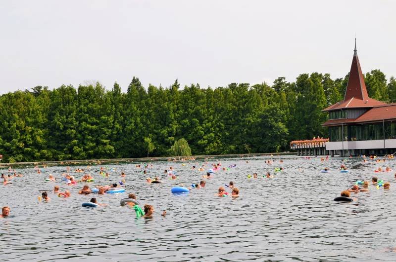 Heute ist der See der größte natürliche und biologisch aktive Thermalsee der Welt und Bad Héviz ein bedeutender Kurort. Der See misst rund 46.000 Quadratmeter. Das Wasser ist ein kalzium- und magnesiumhaltiges Wasserstoff-Karbonat Heilwasser, erreicht bis zu 36 Grad Celsius im Sommer und kühlt im Winter nicht unter 24 Grad ab. Die größte Wirkung erzielt man offenbar, wenn man im Wasser aufrecht „steht“ – deshalb kommen alle mit Schwimmreifen und diesen bunten Schwimmnudeln. Und das sieht dann ziemlich witzig aus, muss ich sagen!