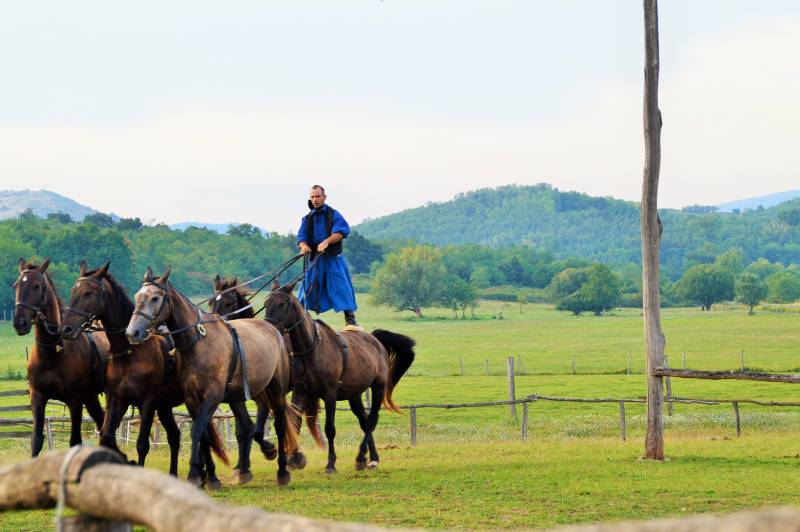 Vor allem aber die Pferde lohnen den Besuch auf dem Hof, finde ich. Es gibt praktisch eine ganze Pferdeherde unterschiedlicher Rassen, die auch in einer abendlichen Reitershow zu sehen sind. Die Vorführung will die Zuschauer ins frühere Ungarn versetzen und zeigt verschiedene Künste der damaligen Hirten.