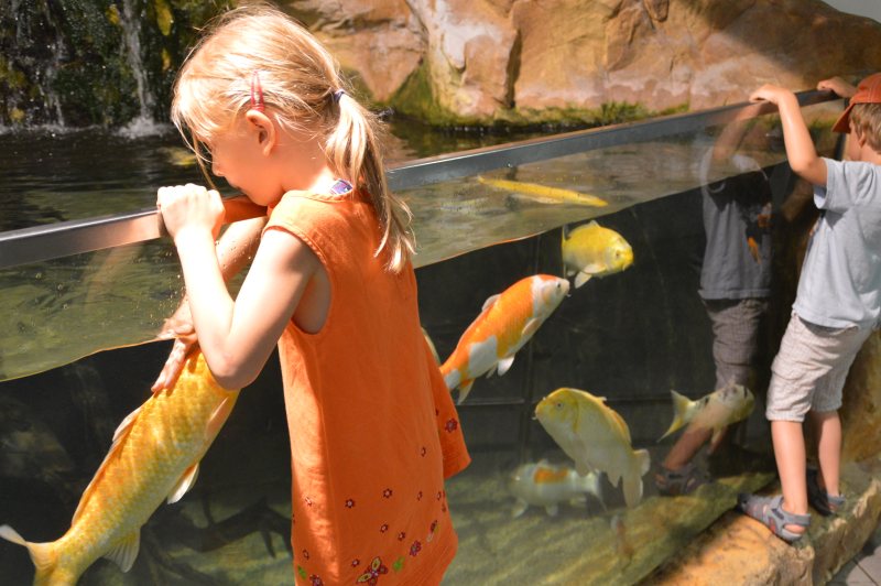 Schon im Erdgeschoss begegneten unsere Kids ihrer Superattraktion: Dort gibt es ein großes Bassin, das oben offen ist und in dem Fische zum Streicheln herumschwimmen. Geniale Idee! Für unsere Kinder war das einer der Höhepunkte der gesamten dreiwöchigen Tour #WienbisBudapest. Auf den anderen Etagen gibt es alles an Fisch, was ihr so in einem Aquarium erwarten könnt. Sehr schön und ungewöhnlich ist das Stockwerk, auf dem man durch einen Dschungel gehen kann und in dem unter anderem Affen, Schildkröten und Fledermäuse frei herumlaufen und fliegen.