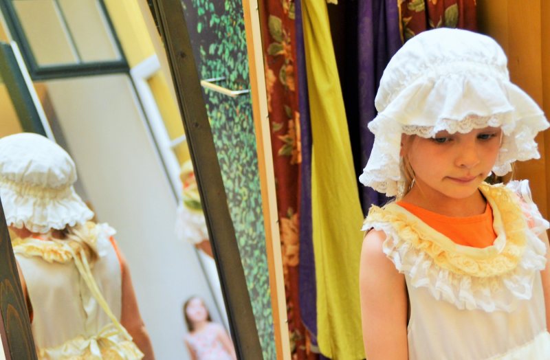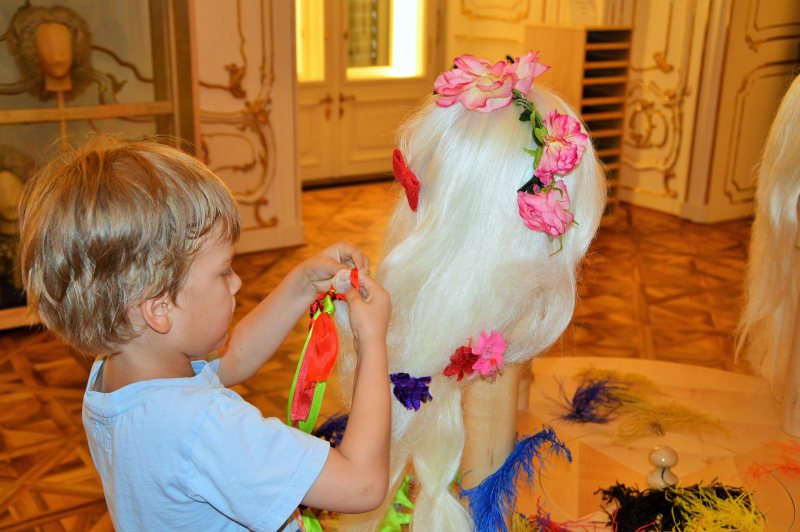 Für etwas größere Kinder wie unsere Tochter (7) eine schöne Tour, Kiddo 2 (4) war nach gut der Hälfte dann nicht mehr wirklich bei der Sache. Aber wir haben ihn irgendwie durchbekommen und sind dann in die Kinderausstellung. Dieser Teil im hinteren Schlossbereich ist ganz auf die Kids zugeschnitten, ebenfalls sehr groß und schön gestaltet. Stellt euch eine Schlossbesichtigung vor, bei der man alles anfassen darf. Ein echter Ausflug ins Prinzen- und Prinzessinnenleben – vom Perückenfrisieren bis zum Servieren an der großen gedeckten Tafel. Am Ende erwartet alle – auch die Erwachsenen – dann ein großes Foyer, in dem Kostüme, Perücken und allerlei Accessoires anprobiert werden können. Wir haben uns natürlich auch verkleidet und vor allem Kiddi 1 war total in ihrem Element. Ein Fest!